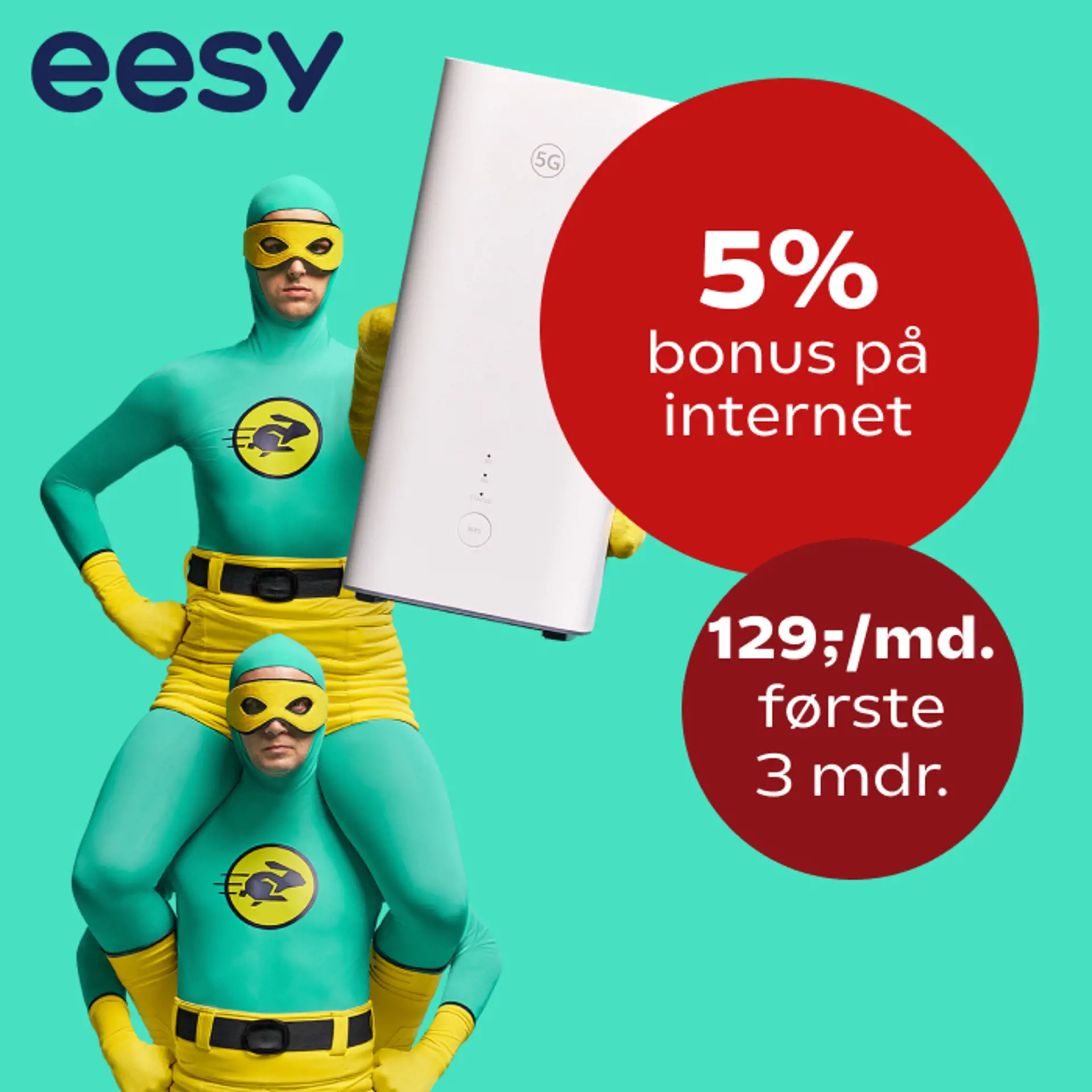 Skift til eesy og få 10% i bonus. Få fx. fri tale og 30 GB data inkl. 5G for kun 99 kr./md