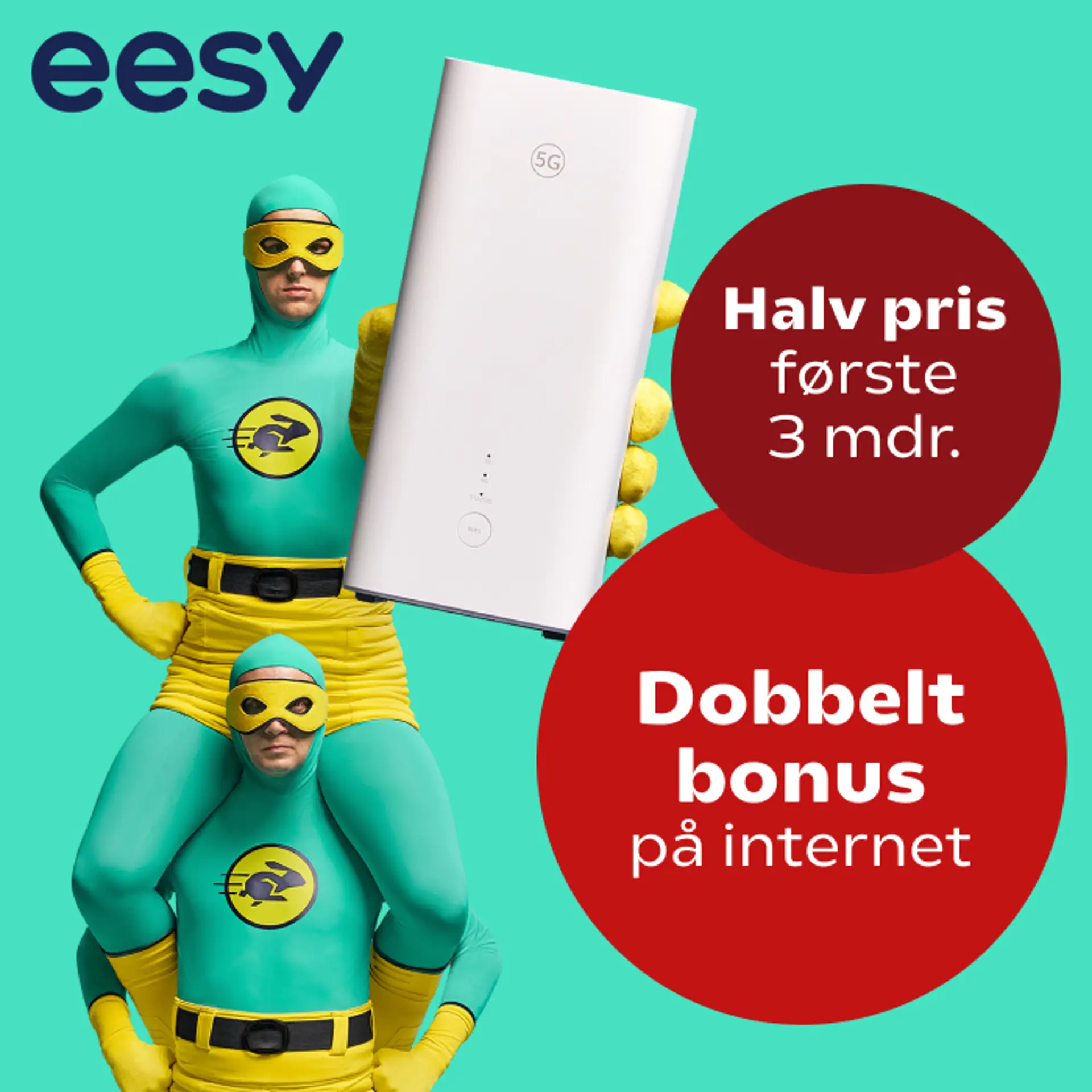 Skift til eesy og få 10% i bonus. Få fx. fri tale og 60 GB data inkl. 5G for kun 89 kr./md