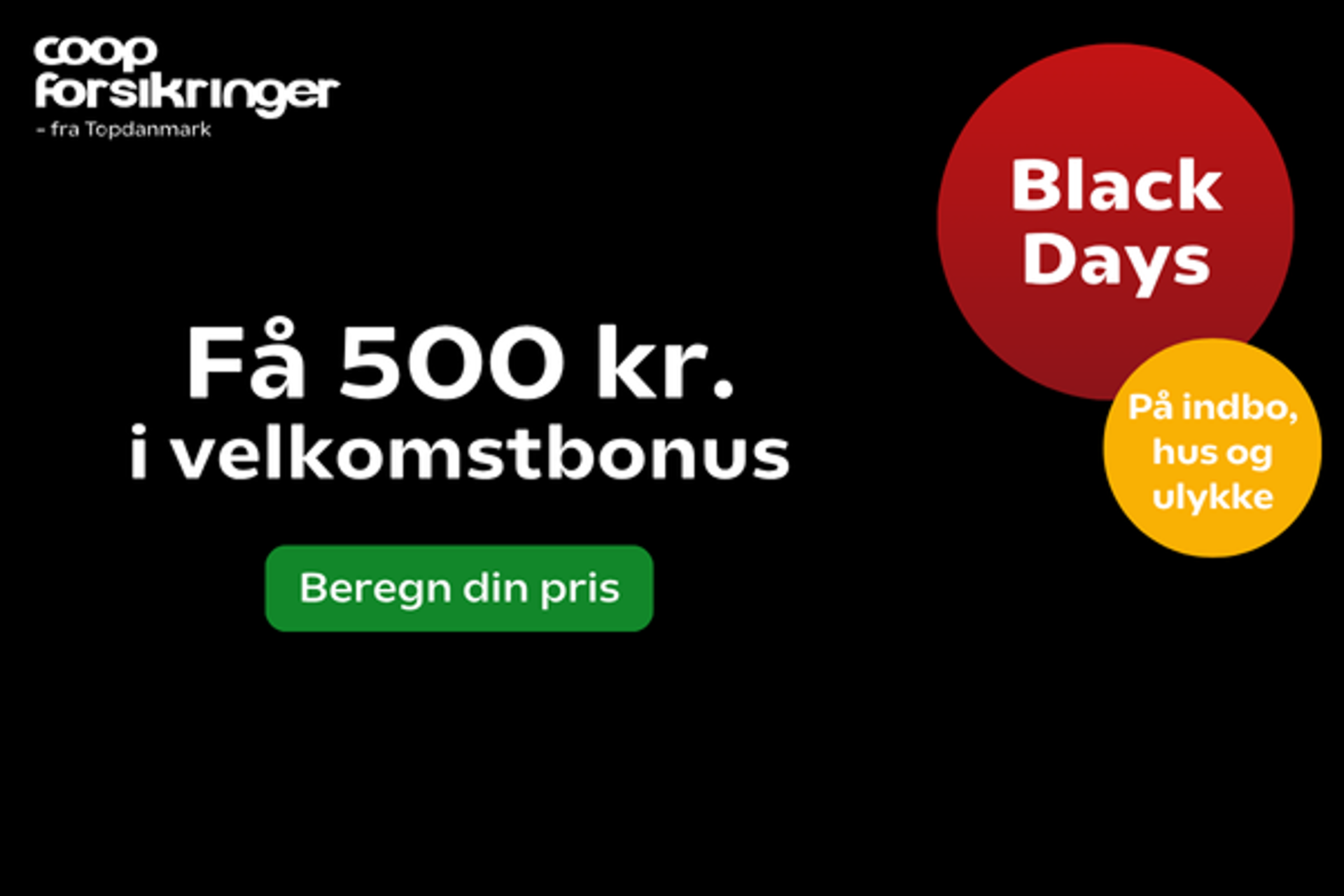 Vi holder Black Days med 500 kr. i velkomstbonus på udvalgte forsikringer (normalt 250 kr.). Tilbuddet gælder Indbo-, hus- og ulykkeforsikringer.